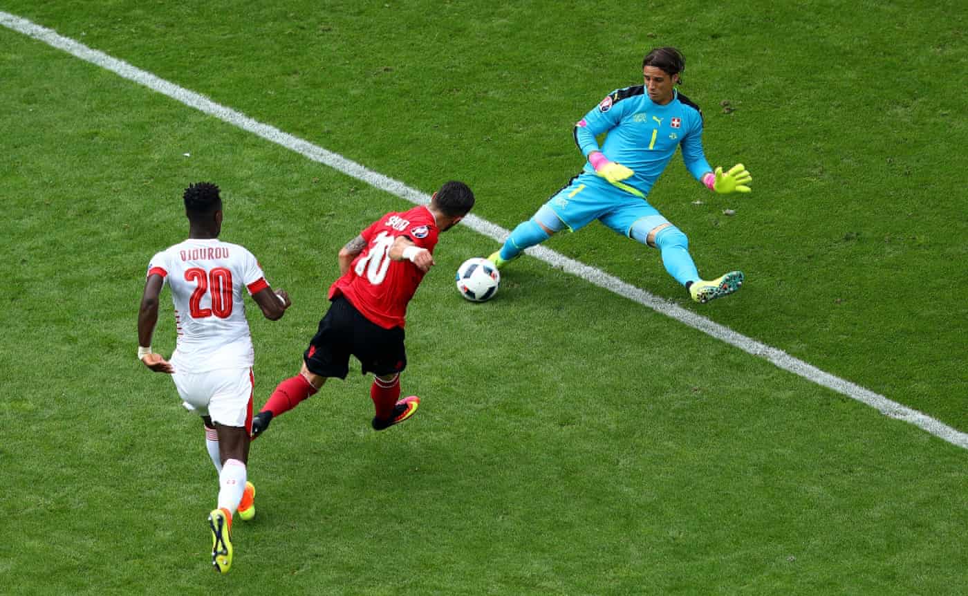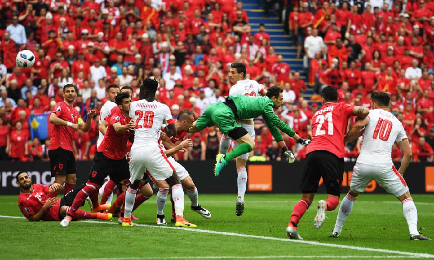 Двамата братя Гранит Джака от отбора на Швейцария и Таулант Джака от отбора на Албания в единоборство