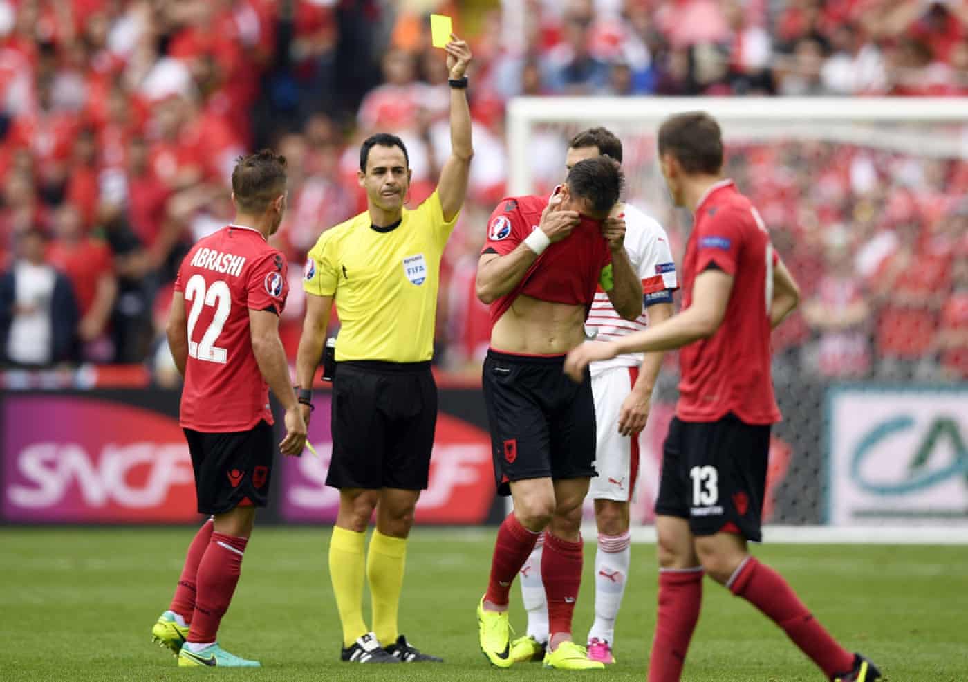 Съдята Карлос Веласко (Испания) показва жълт картон на капитана Лорик Кана