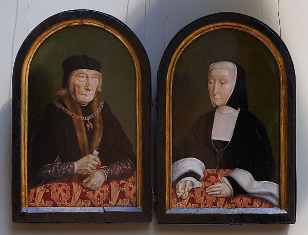 In 1484, the future count Jan van Egmond married Magdalena van Werdenburg, when he was forty-six and she was twenty years old. Evidently these portraits depict an older couple; rather than celebrating the marriage, they were probably painted upon Jan’s death. The wizened count wears his highest honor, a collar of the Order of the Golden Fleece, while Magdalena is depicted as a widow, with a black band around her wedding ring. She holds a pink, a symbol of marriage, but unlike the one in a nearby painting (49.7.23), the flower is turned downward, as if to acknowledge Jan’s passing.